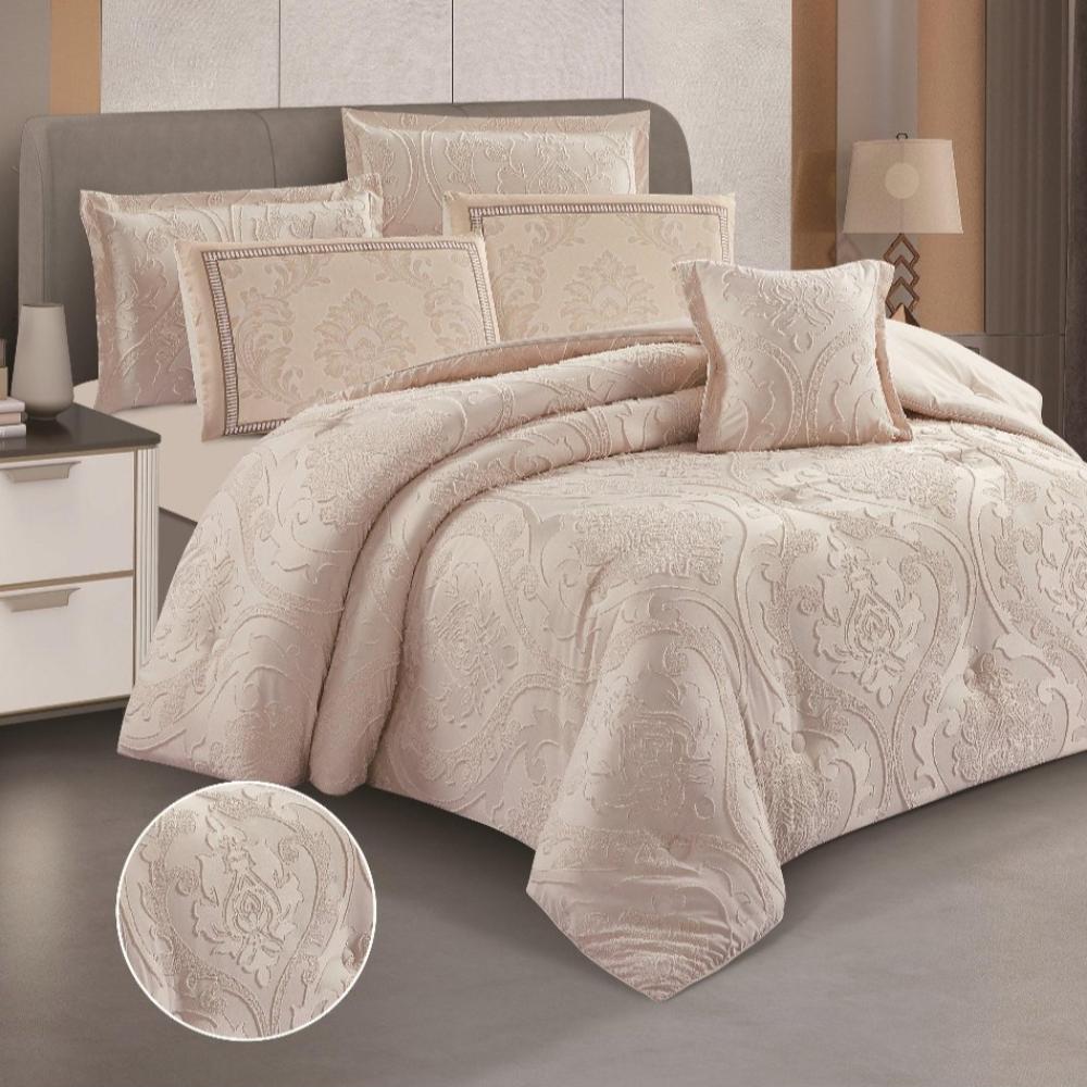 يأتي المفرش بتصميم أنيق وعصري يضفي لمسة من الفخامة على غرفة نومك، مع خامة متينة وسهلة التنظيف، ومقاومة للتجعد والانكماش، مما يجعله عمليًا للاستخدام اليومي.