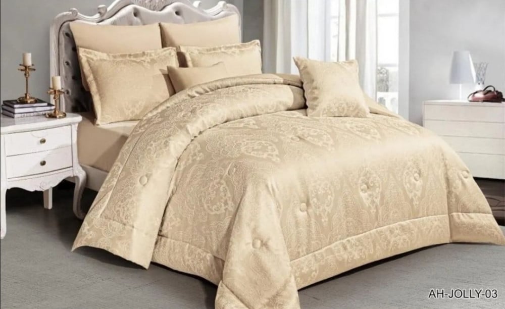 يتميز مفرش جولي بأنه محاك بتقنيه الجاكار حيث تتداخل الخيوط مع بعضها بعدة طبقات لينتج رسومات مطرزة فاخرة وثابتة ، يتميز مفرش جولي بحشوة كبيرة وثابتة ونعومة وتنسيق الالوان تبعث لك الراحة والنوم الهانئ ذات تصميم جميل و فاخر تُناسب جمال البدايات و يحتفظ برونقه و جماله مصنوع من أجمل و أجود أنواع الأقمشة التي تدوم لسنواتٍ طويلة دون أن تهترئ