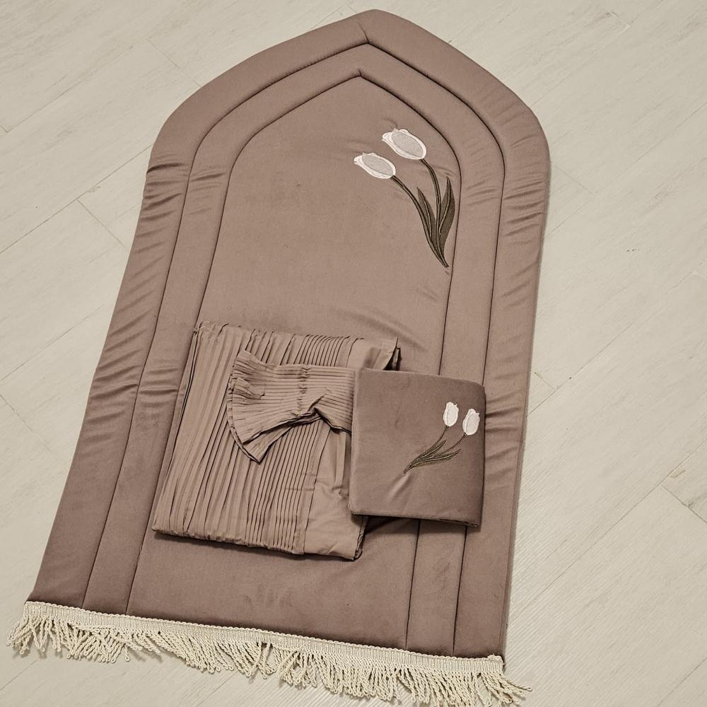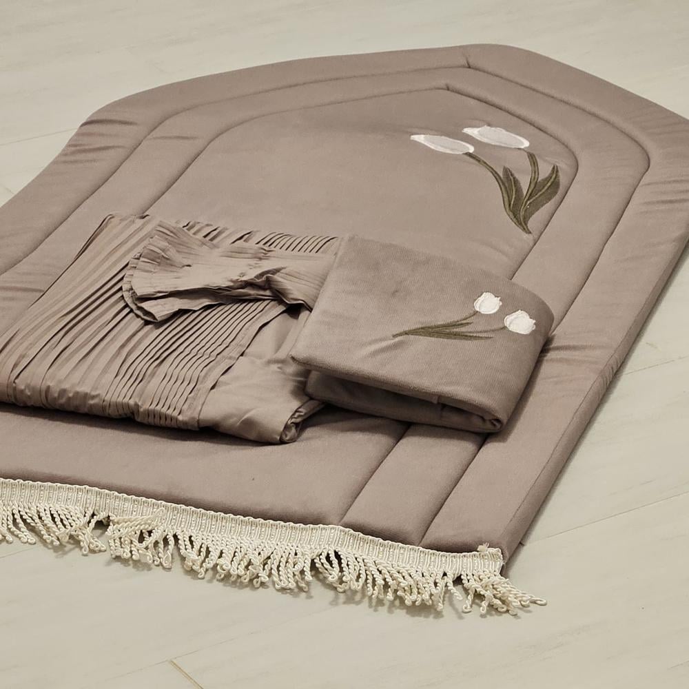 سجادة الصلاة المبطنّة بتصميم التوليب تجمع بين الراحة والجمال، مما يعزز تجربة الصلاة ويجعلها أكثر خشوعًا.