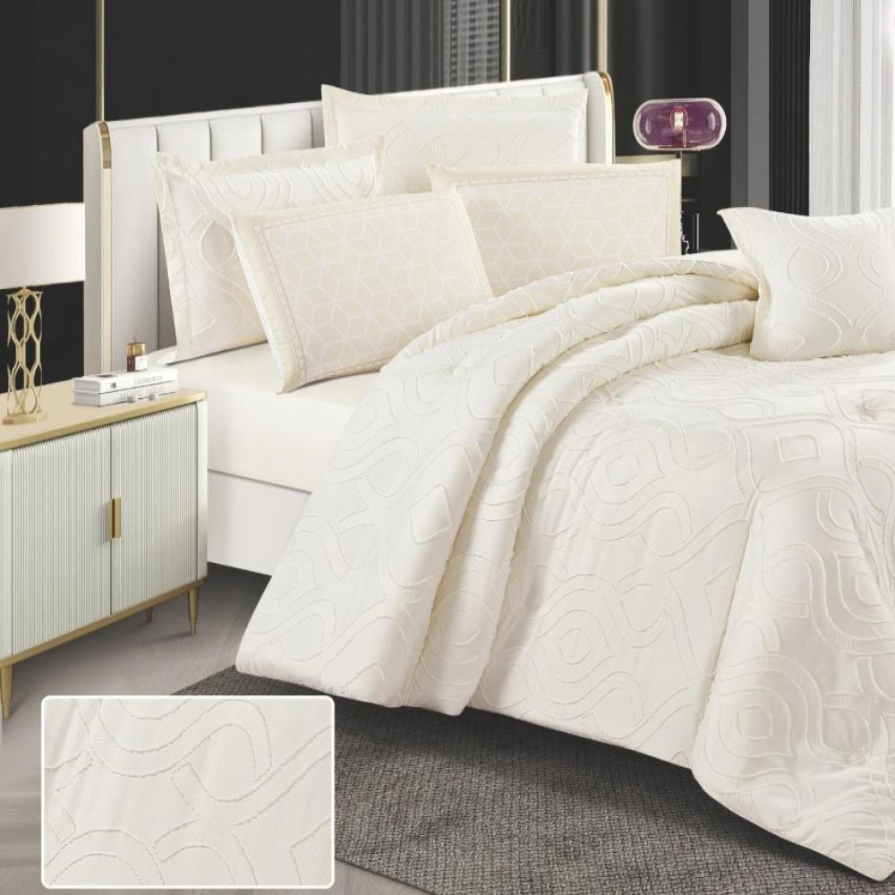 يأتي المفرش بتصميم أنيق وعصري يضفي لمسة من الفخامة على غرفة نومك، مع خامة متينة وسهلة التنظيف، ومقاومة للتجعد والانكماش، مما يجعله عمليًا للاستخدام اليومي.